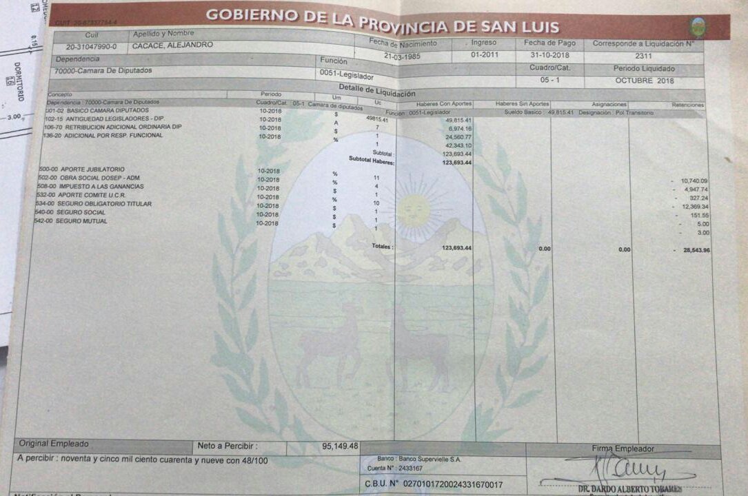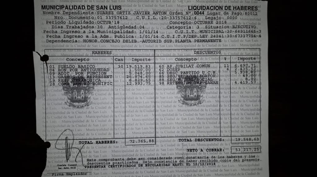 Por último, y para contextualizar aún más lo que ganan diputados y ministros, La Gaceta Digital consiguió el recibo de sueldo de un concejal de San Luis, el cual fue aportado por Javier Suárez, de Avanzar y Cambiemos. El recibo del concejal, que no incluye antigüedad ya que tiene menos de 5 años en la función pública, es de $53.217,25. El bruto es $72.765 ,88, mientras que las retenciones ascienden a casi $20.000.