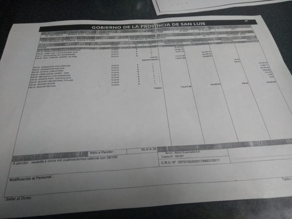 Así es como, el recibo de sueldo correspondiente al mes de octubre de este año muestra que Mones Ruiz cobró $95.414,39. Esta cifra es el resultado de los $112.017,56 que percibe como haberes con aportes, más los $33.209 en calidad de haberes sin aportes, menos unos $50.000 en retenciones.