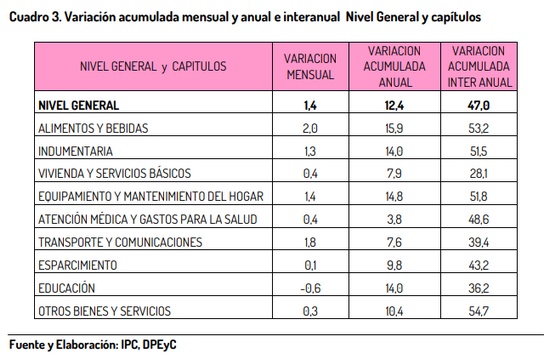 La Dirección Provincial de Estadística y Censos reveló hoy que la inflación de mayo de 2020 fue del 1,4%, mientras que la inflación nacional del mismo periodo, según el Indec, fue del 1,5%. Por su parte, la inflación interanual en el periodo de mayo 2019 a mayo 2020 fue del 47% según la Dirección Provincial, y del 43,4% según el Indec.