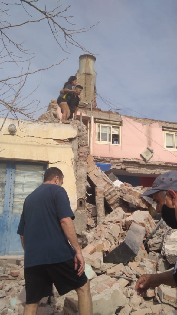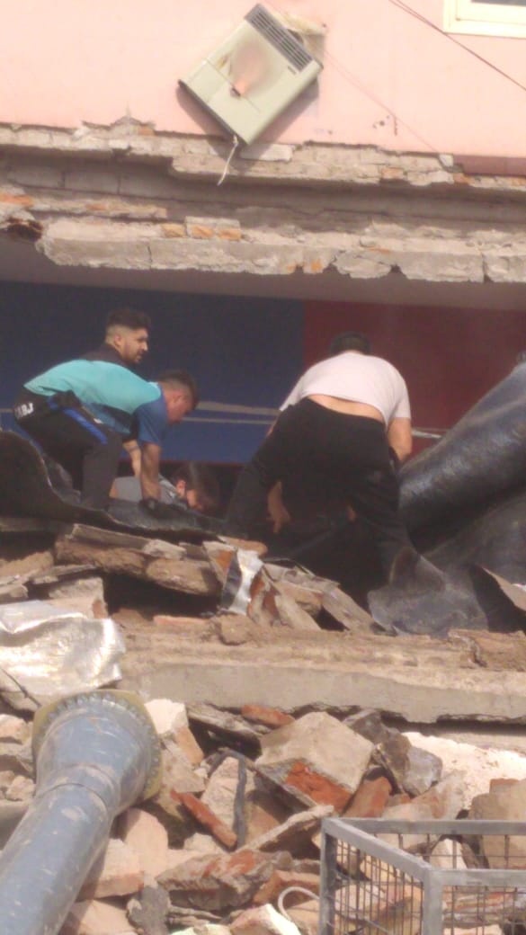 Siendo las 16.30, 3 personas han sido rescatadas de entre los escombros y se trabaja arduamente para encontrar más gente. Por lo que marcaron los canes de la Policía y lo dicho por uno de los rescatados, que está internado en el Hospital San Luis, quedaría una persona atrapada entre los escombros.
