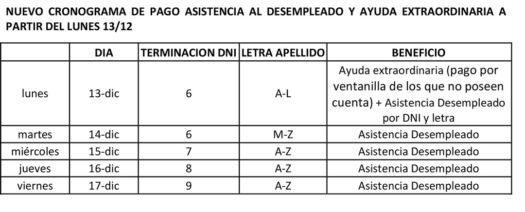 Desde este lunes rige un nuevo cronograma de pago de la asistencia al desempleado y la ayuda extraordinaria a trabajadores privados. El ministro de Hacienda Pública, Eloy Horcajo, informó que el cronograma original para los desocupados se extendía hasta el 22 de diciembre, pero con esta modificación se posibilitará que el 17 todos los beneficiarios hayan cobrado, disponiendo así de más tiempo para realizar las tradicionales compras navideñas.