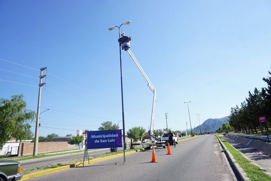 La Municipalidad de San Luis continúa con los trabajos de embellecimiento, renovación y mejoras en las rotondas de la avenida Vía del Peregrino. Se trata de una intervención integral que es desarrollada en conjunto por distintas áreas. Este martes, las labores consistieron en el recambio de luminarias a LED a lo largo de todo el bulevar central.