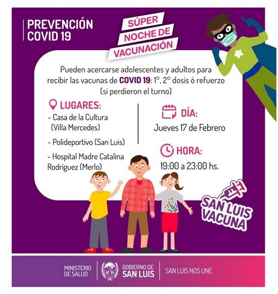 El Ministerio de Salud, organizó para este jueves la “Súper Noche de Vacunación”, un operativo en un horario nocturno para que todos los sanluiseños completen sus esquemas de vacunación contra el Covid. Se realizará tanto en la ciudad de San Luis como en Villa Mercedes y Merlo.