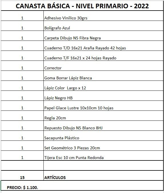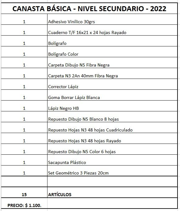 Para el nivel inicial, el combo cuenta con 20 artículos, en tanto que, para el nivel primario y secundario el pack contiene 15 materiales cada uno. Cabe destacar que cada canasta es un producto único e indivisible, por lo que solo se comercializa en forma completa, no fraccionado.