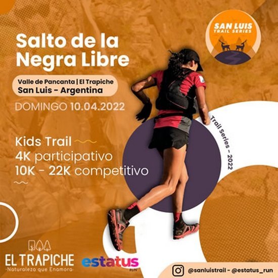 La carrera tiene un cupo máximo de 600 participantes en todas las distancias y categorÃas. Las inscripciones están abiertas en https://meinscribo.com/sanluistrailseries/tc-events/salto-de-la-negra-libre-trail/