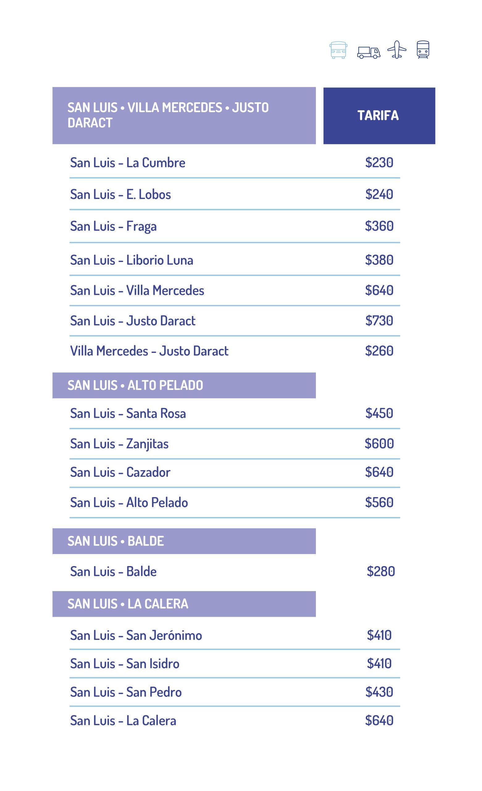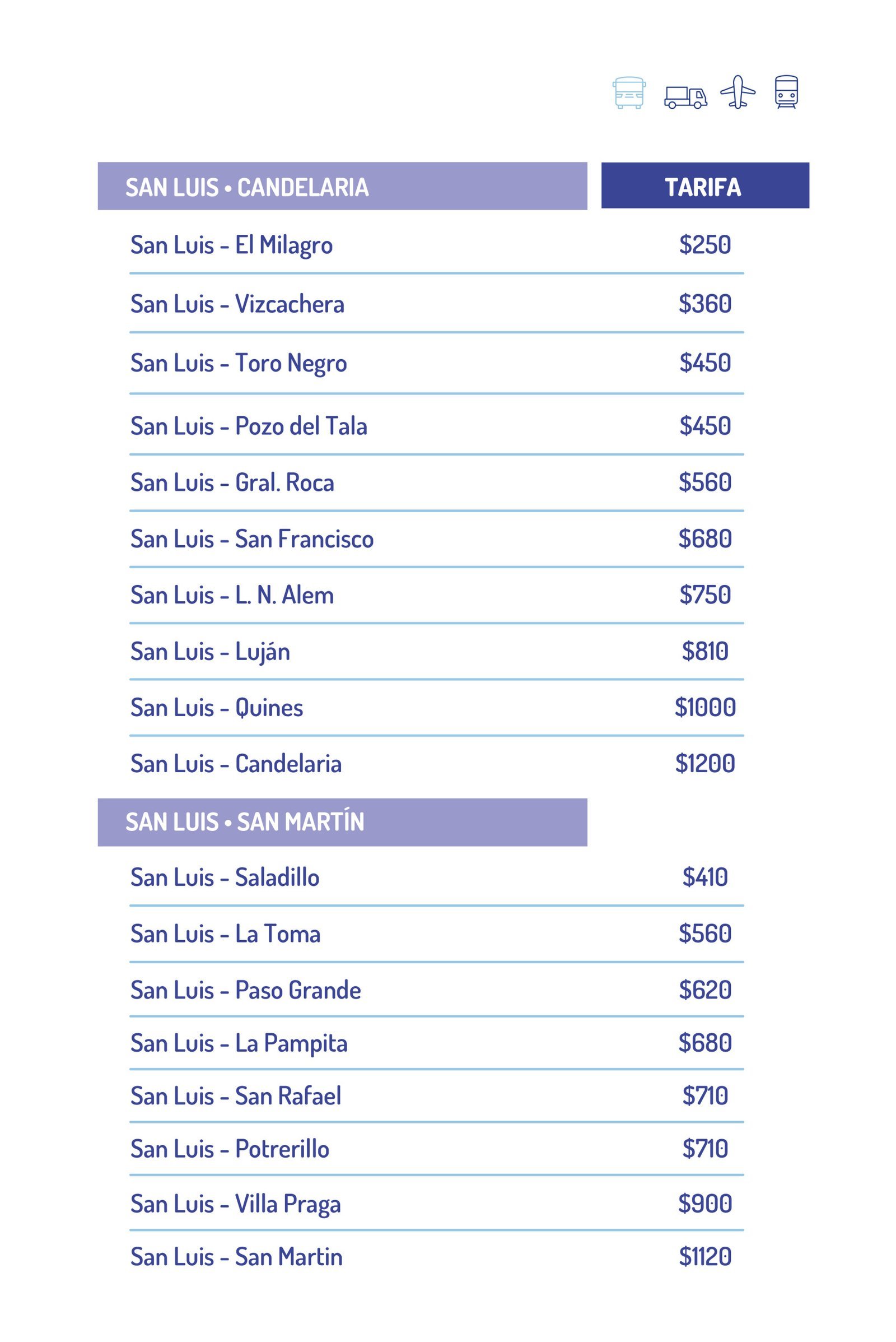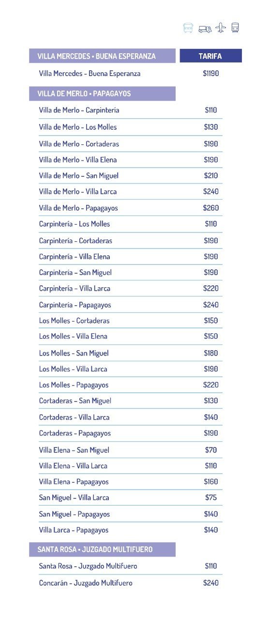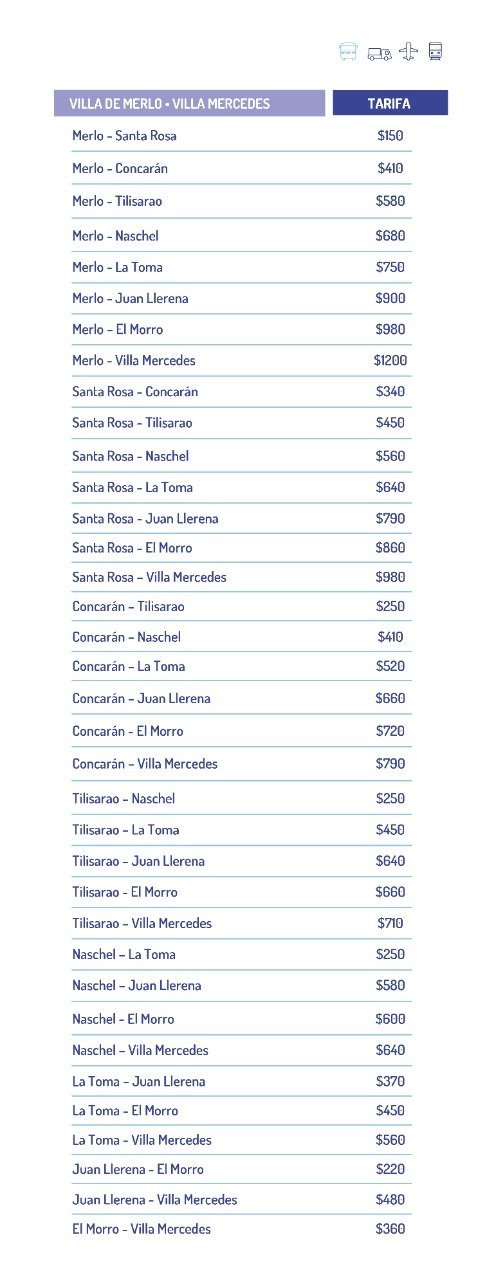 Los aumentos son cercanos al 28%, como ya anunció la vocera de las empresas de transporte cuando se resolvió el conflicto. Por ejemplo, San Luis – La Punta aumentó de $110 a $140, lo que supone un 27,7%, mientras que de la Capital a Estancia Grande se va a $190 tras un aumento del 26,6%.