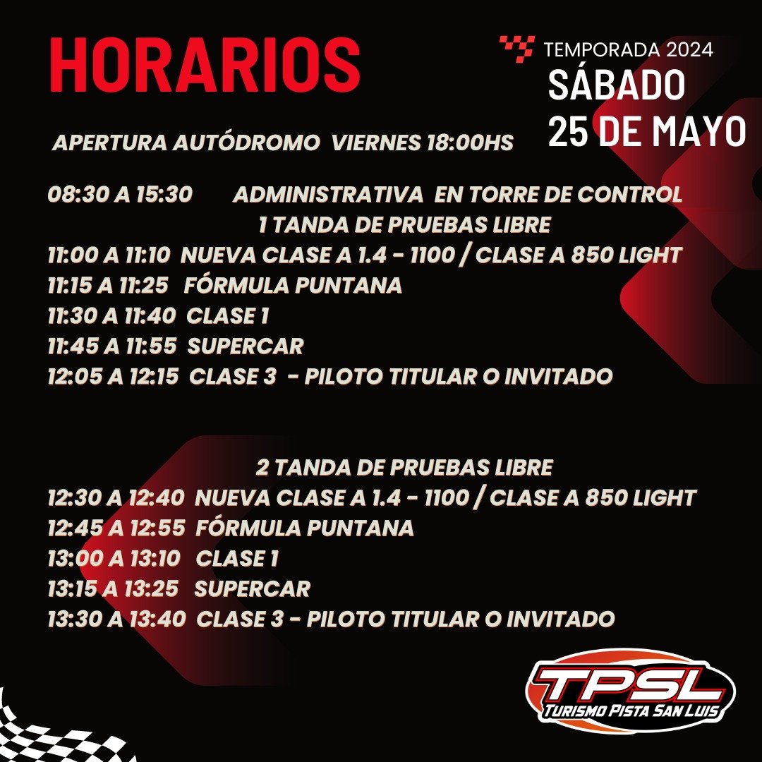 Los amantes del automovilismo tendrán una cita este fin de semana en el ‘Rosendo Hernández’. El Turismo Pista San Luis disputará la segunda fecha de la temporada 2024 con un importante parque de máquinas y pilotos invitados en alguna de las seis categorías que estarán presentes. La entrada general tiene un valor de $2.000 y el estacionamiento será gratuito.