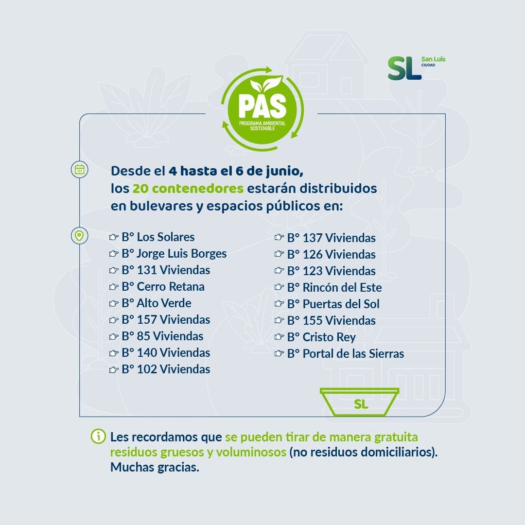 El miércoles de la semana pasada, la Municipalidad de San Luis lanzó el Programa Ambiental Sostenible (PAS) e inició con la colocación de 20 contenedores en el barrio Eva Perón y sus anexos para que los vecinos arrojaran los residuos gruesos. En solamente tres días se recolectaron en los contenedores 25 toneladas de residuos.
