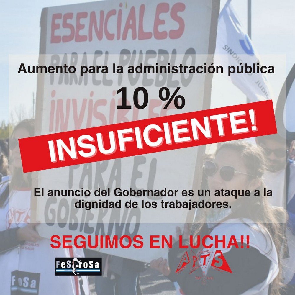 “El anuncio del Gobernador sobre el ‘aumento’ salarial del 10% para la administración pública es un ataque a la dignidad de los trabajadores. La inflación actual mata nuestros salarios”, dice parte de un posteo en las redes sociales de APTS.