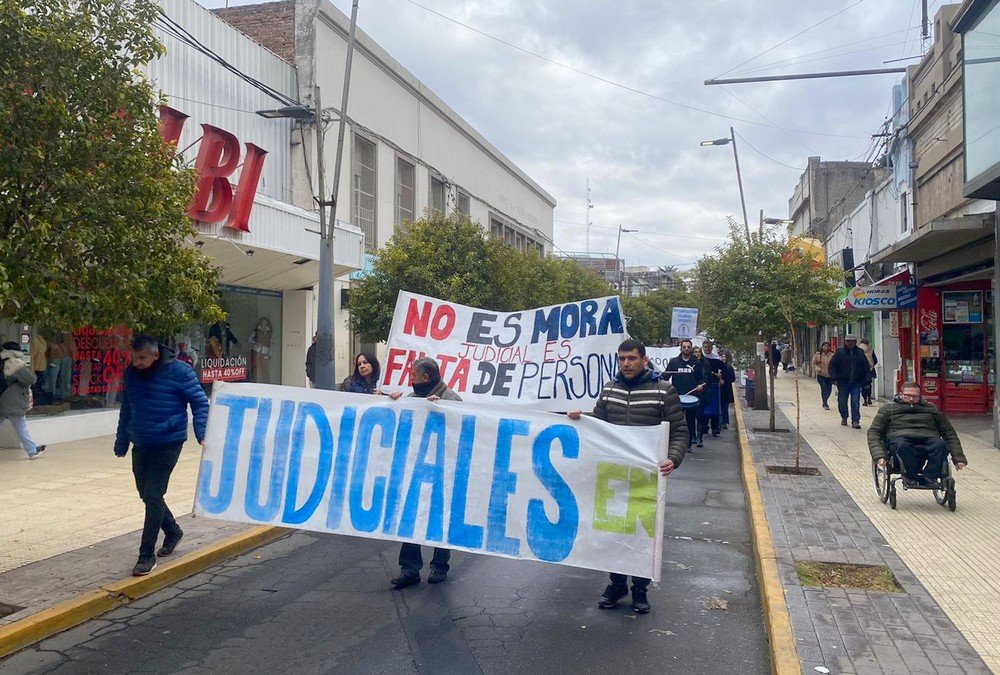 Los empleados del Poder Judicial de San Luis continúan su lucha por salarios dignos, en medio de un contexto económico cada vez más crítico. Continúan los ceses de actividades de 12 a 14 horas los lunes, miércoles y viernes, mientras que los martes y jueves son de 10 a 12 y esta semana se retoman las movilizaciones esos mismos días. Estas medidas ya llevan en pie 4 meses, contando siempre con un gran acatamiento de los trabajadores judiciales.