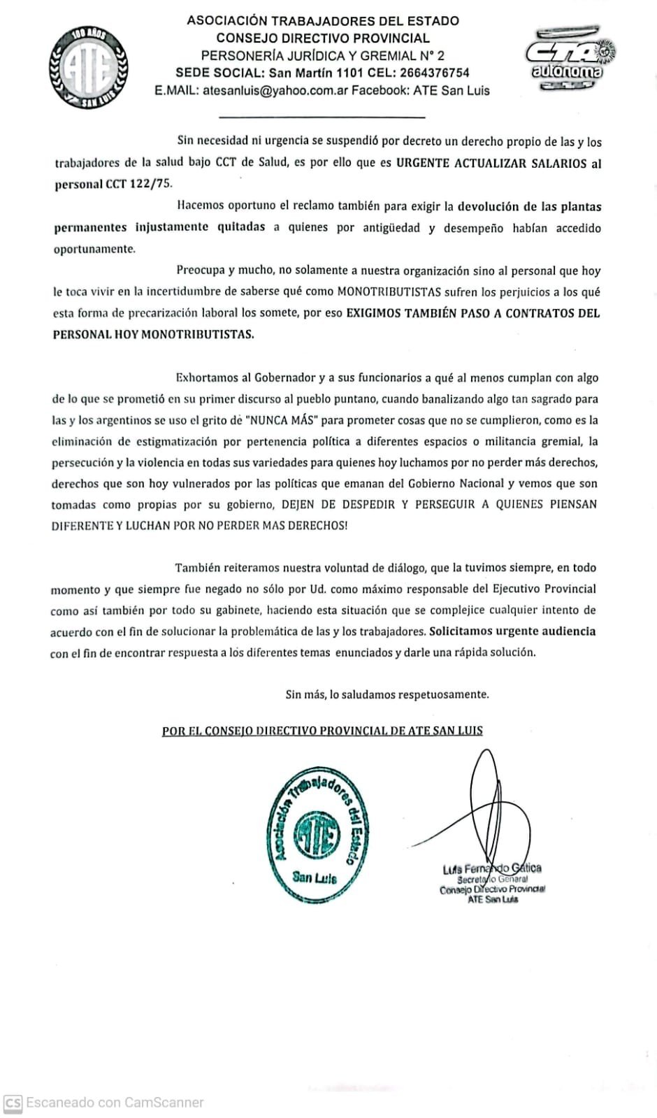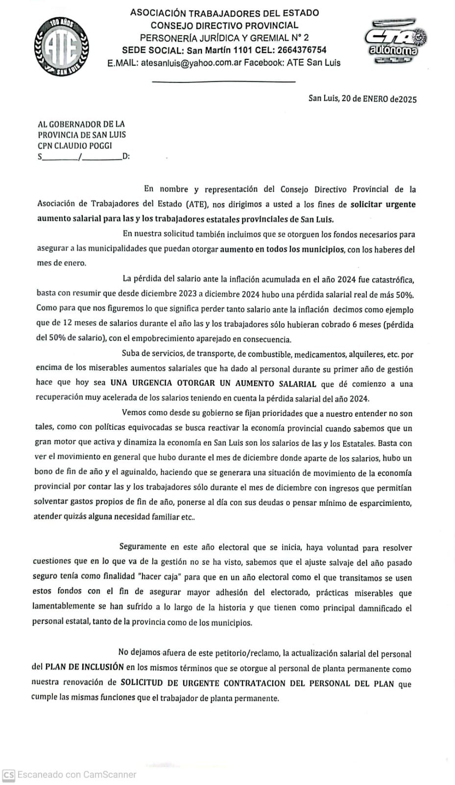 La Asociación de Trabajadores del Estado (ATE) en San Luis, liderado por Fernando Gatica, emitió una carta al gobernador Claudio Poggi solicitando un aumento salarial urgente para los trabajadores estatales provinciales. La misiva también incluye un pedido para que las municipalidades reciban los fondos necesarios para otorgar aumentos en enero.