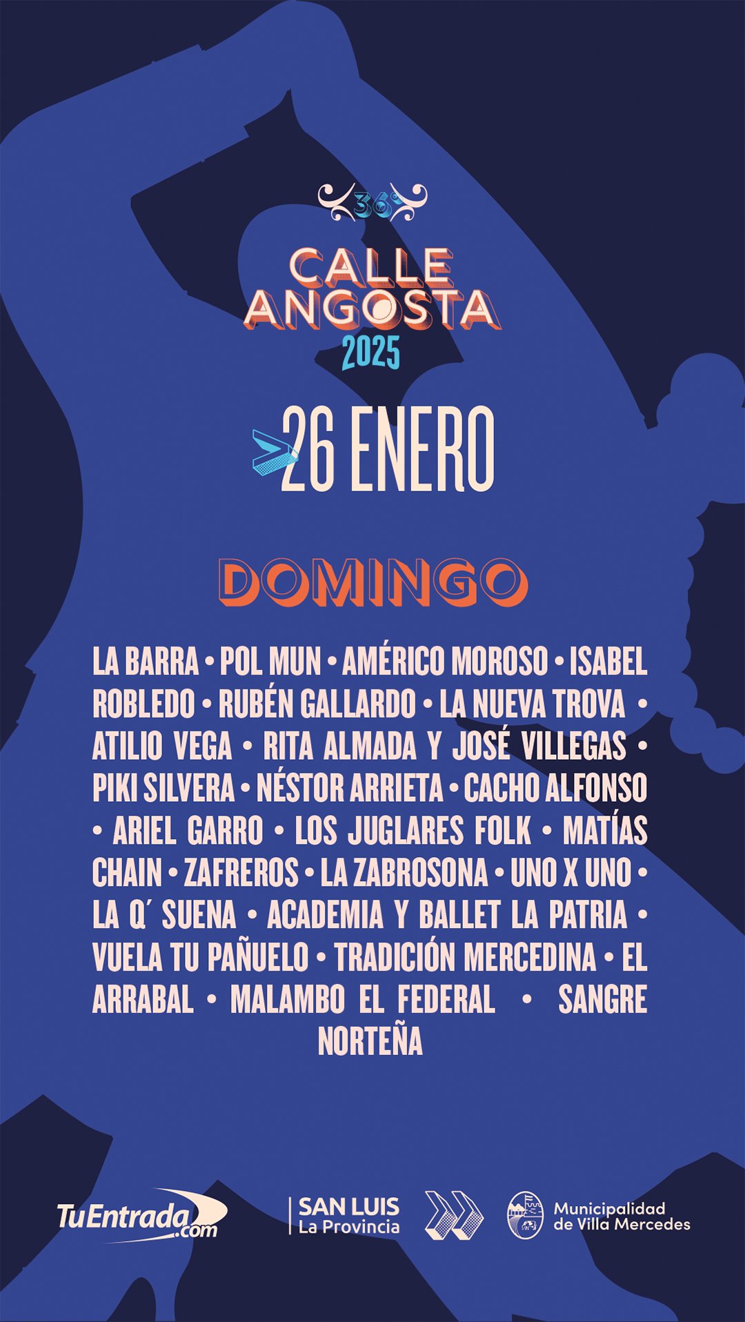 El anfiteatro Alfonso y Zavala de Villa Mercedes ya está listo para recibir la 36° Fiesta Nacional de la Calle Angosta en la que desde este jueves 23 hasta el domingo 26 harán su paso por el escenario principal artistas locales e importantes figuras nacionales que le podrán ritmo y folclore a cada una de las noches, como Jorge Rojas, Los Cantores del Alba, Destino San Javier, Indio Rojas, Por Siempre Tucu y La Barra, entre otros.