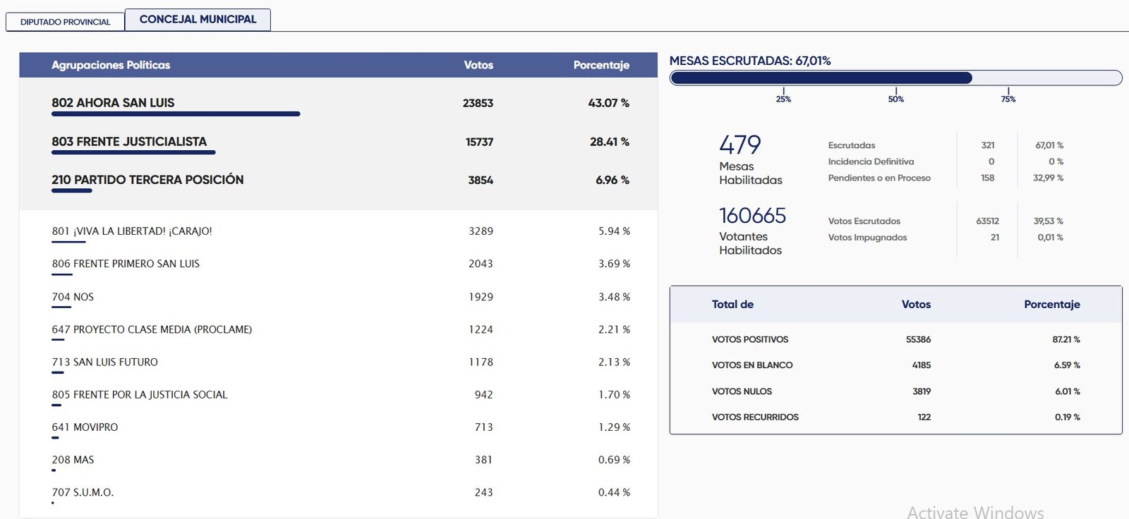Hace minutos se dieron a conocer los primeros resultados de los comicios de hoy domingo y el oficialismo de Gastón Hissa, a través del frente Ahora San Luis, tiene el primer lugar, con un 43% de los votos y un 67% de mesas escrutadas.