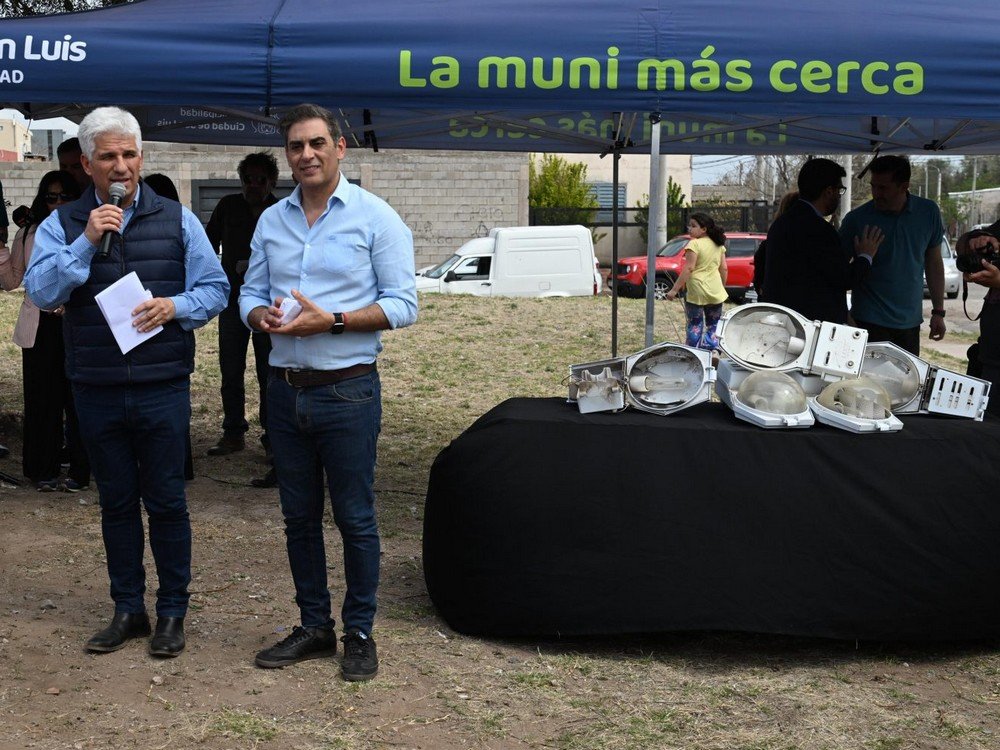 El intendente de la ciudad de San Luis, Gastón Hissa, y el gobernador Claudio Poggi encabezaron este miércoles el acto por la instalación de 100 nuevas luminarias LED en el barrio 200 Viviendas Municipales como parte del plan Iluminando Tu Barrio.