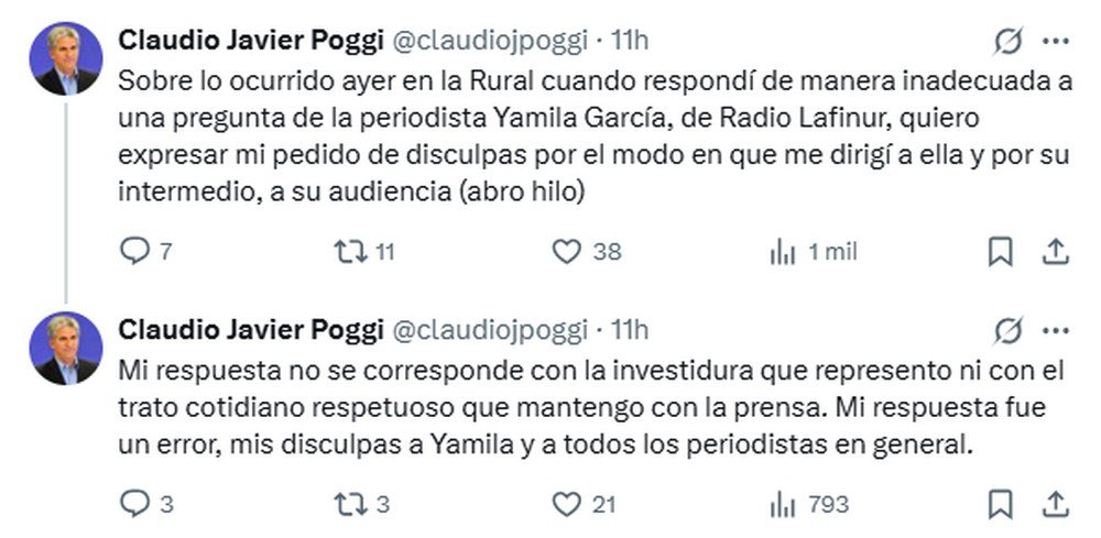“Sobre lo ocurrido ayer en la Rural cuando respondí de manera inadecuada a una pregunta de la periodista Yamila García, de Radio Lafinur, quiero expresar mi pedido de disculpas por el modo en que me dirigí a ella y por su intermedio, a su audiencia. Mi respuesta no se corresponde con la investidura que represento ni con el trato cotidiano respetuoso que mantengo con la prensa. Mi respuesta fue un error, mis disculpas a Yamila y a todos los periodistas en general”, publicó el mandatario.