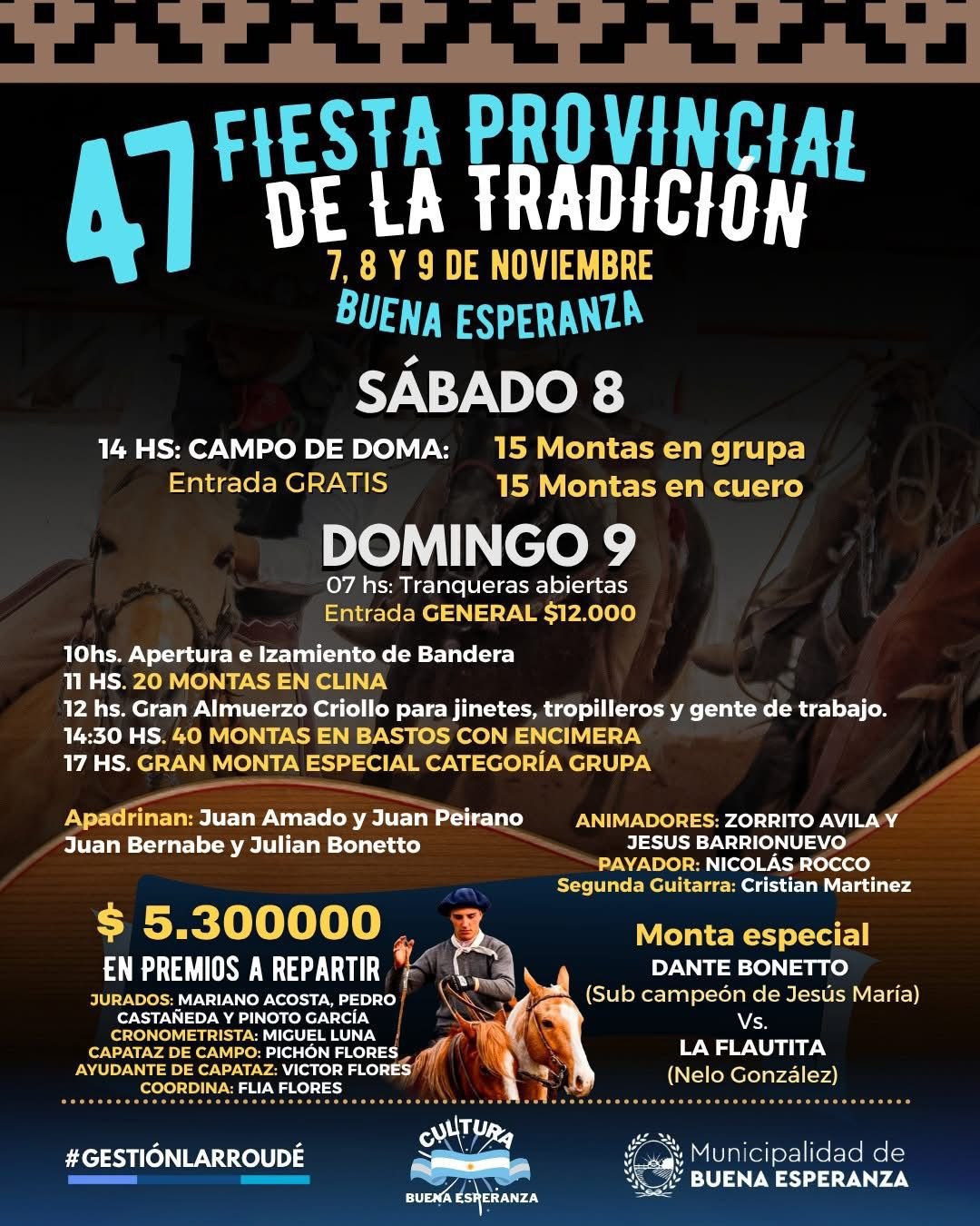 Finalmente, el domingo 9 estará dedicado a la jineteada, que comenzará a las 10 de la mañana y contará con la participación de destacados jinetes como Dante Bonetto, subcampeón de Jesús María, junto a destacadas tropillas y montas locales.