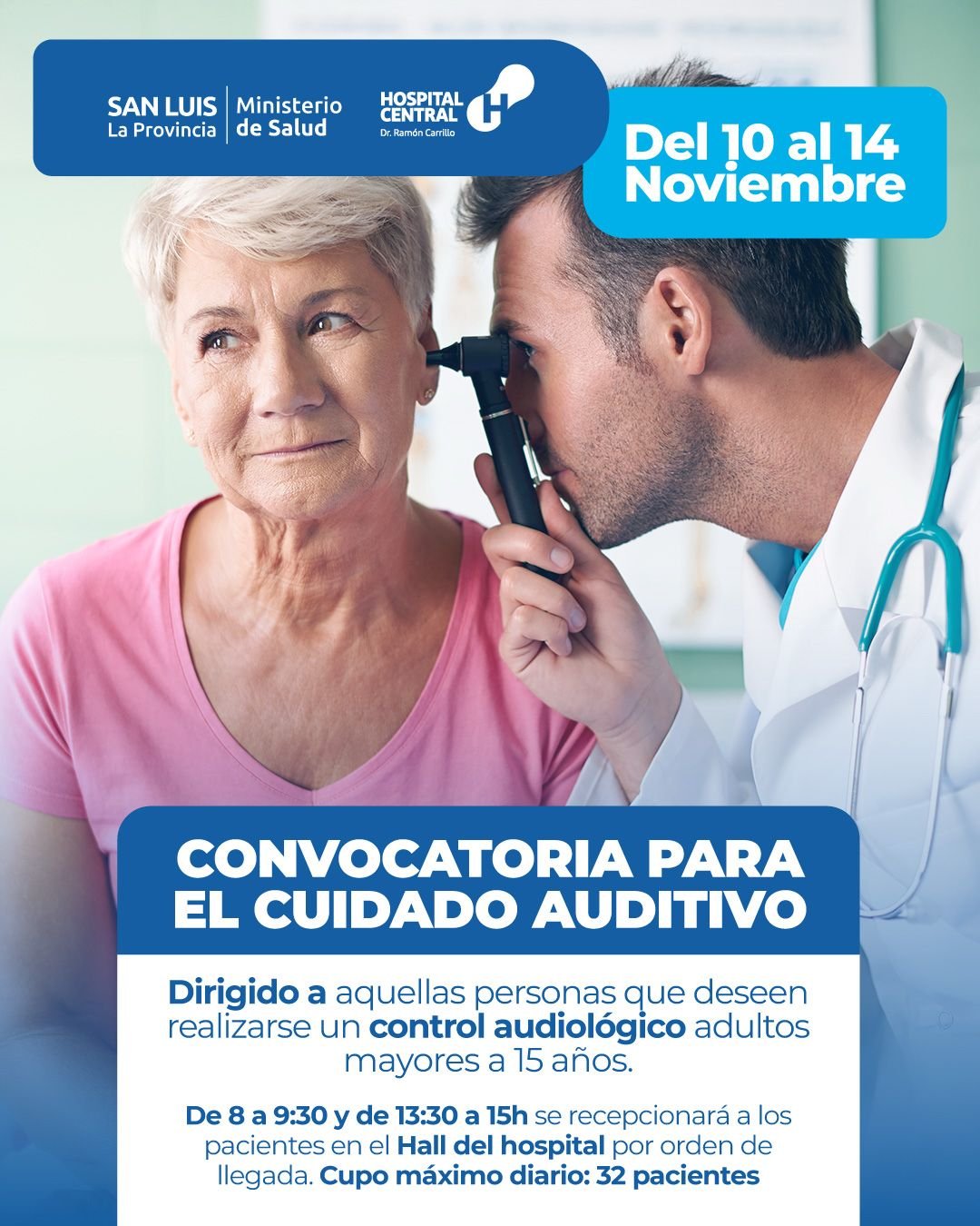 A través del Servicio de Fonoaudiología, el hospital central Dr. Ramón Carrillo invita a la comunidad a participar de unas jornadas especiales de estudios para detección de patologías y control auditivo, que se llevarán a cabo del 10 al 14 de noviembre en este centro médico.