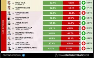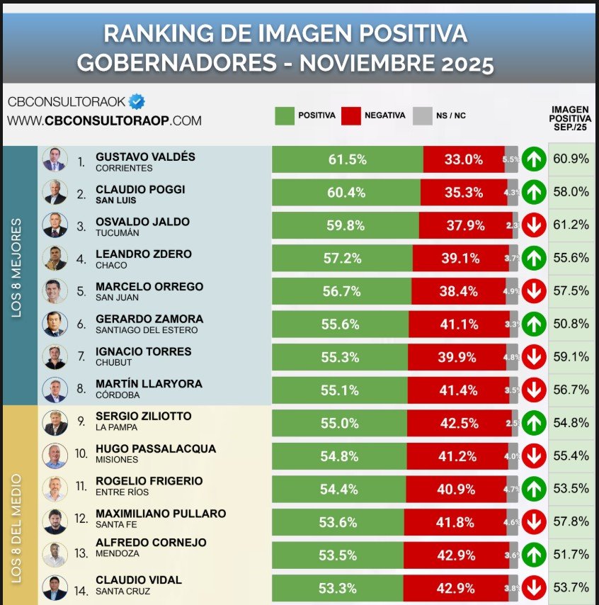 Por otro lado, los gobernadores peor calificados del mes de noviembre de 2025 son, en último lugar, Alberto Weretilneck (Río Negro) con un 43,3% de imagen positiva, seguido por Axel Kicillof (Provincia de Buenos Aires) con un 47,4% y y luego Ricardo Quintela (La Rioja) con un 48,0%.