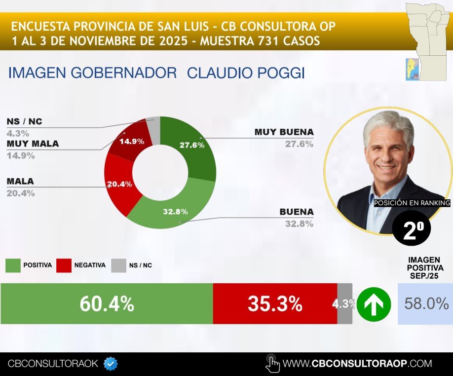 Esta semana, la consultora CB de Buenos Aires, publicó su ranking de imagen de positiva de los 24 distritos del país (se incluye la Ciudad Autónoma de Buenos Aires). En el mismo, el gobernador de San Luis, Claudio Poggi, ocupa el segundo lugar, con un 60,4% de imagen positiva, siendo solo superado por Gustavo Valdés, su par de Corrientes, que tiene un 61,5%. El top 3 lo completa Osvaldo Jaldo, de Tucumán, con un 59,8%.