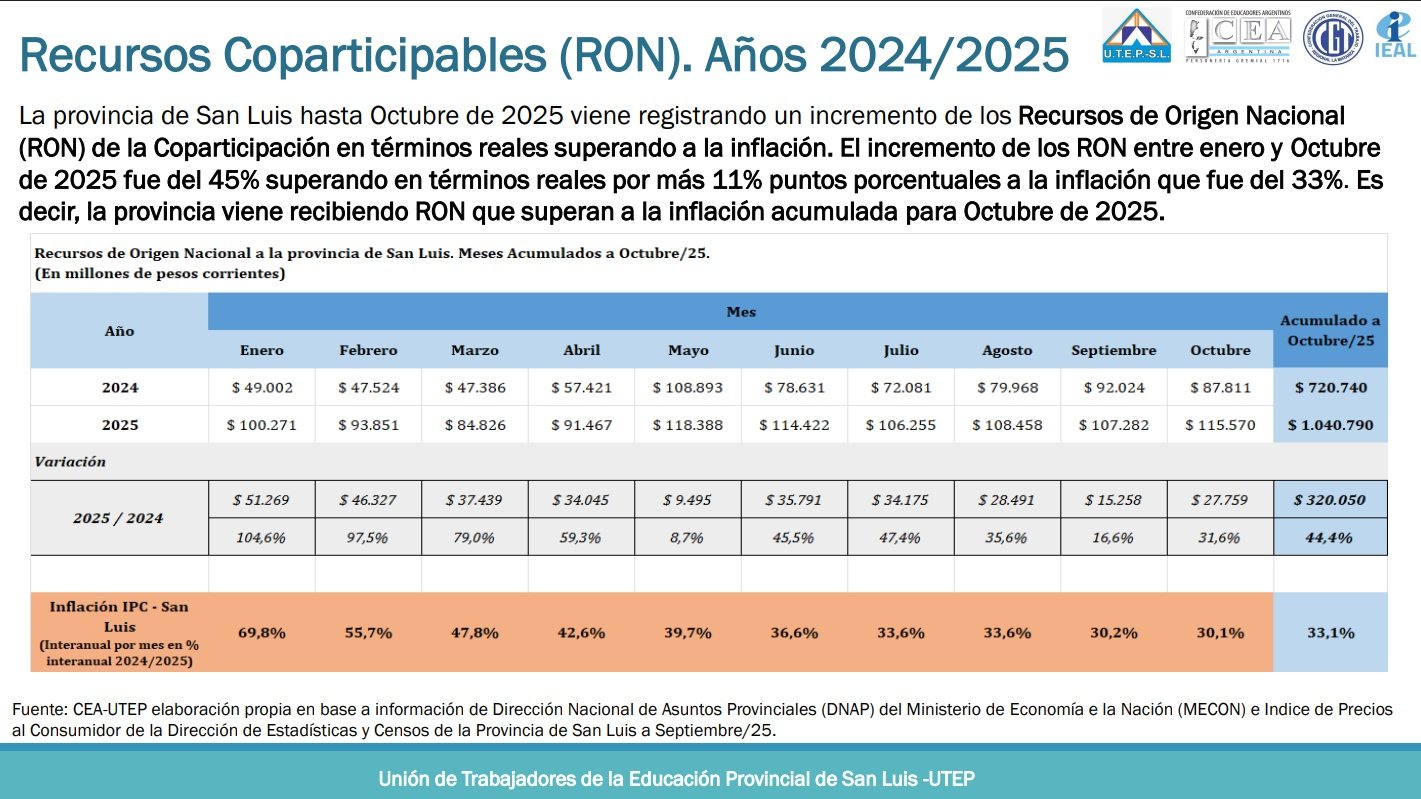 Entre enero y octubre de 2025, los recursos coparticipables de origen nacional que recibió la provincia de San Luis aumentaron 45% en términos nominales, un crecimiento que supera en más de 11 puntos porcentuales la inflación acumulada en el mismo período, según un informe elaborado por la Unión de Trabajadores de la Educación Provincial (UTEP) de San Luis, que forma parte de la Confederación de Educadores Argentinos (CEA).