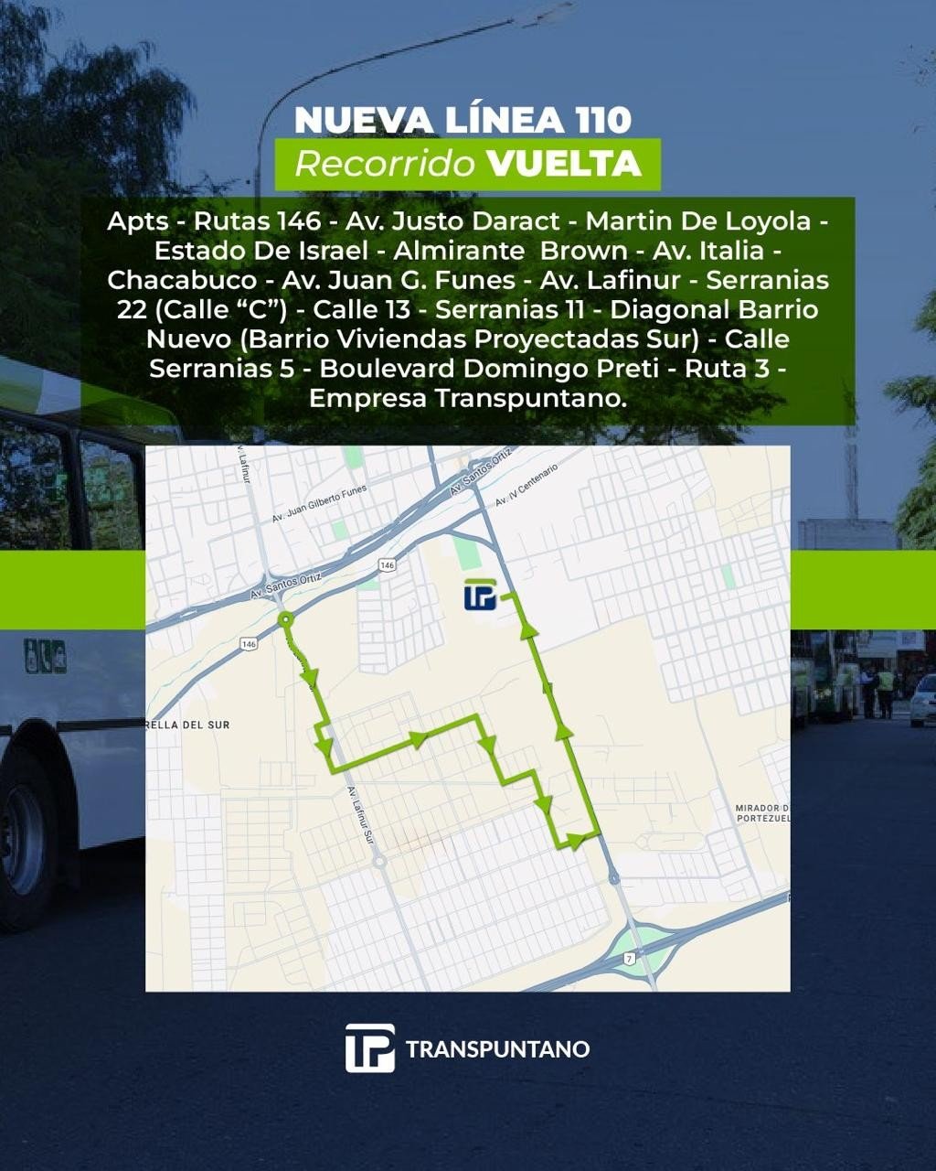 Transpuntano estrena este lunes la línea 110 que tiene como cabeceras el barrio APTS, ubicado a la vera de la Ruta 146, y la base de la empresa. Por lo tanto, realiza un recorrido desde el sur al norte de la ciudad de San Luis.