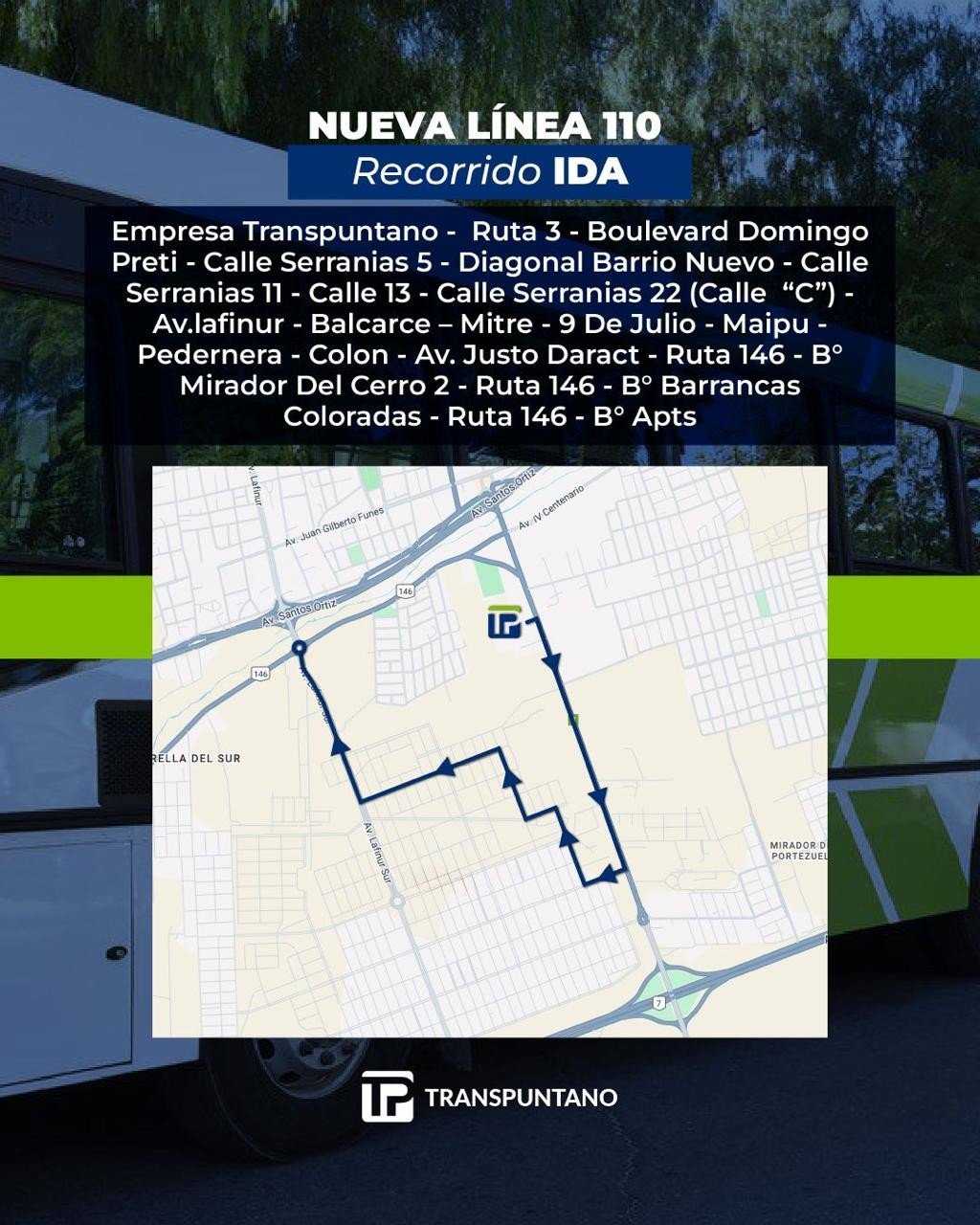 Transpuntano estrena este lunes la línea 110 que tiene como cabeceras el barrio APTS, ubicado a la vera de la Ruta 146, y la base de la empresa. Por lo tanto, realiza un recorrido desde el sur al norte de la ciudad de San Luis.