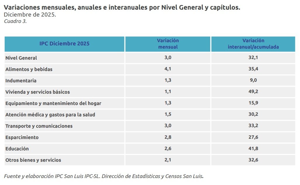 Este martes, la Dirección Provincial de Estadística y Censos publicó el índice de precios al consumidor (IPC) local, el cual registró una inflación del 3% durante el pasado mes de diciembre. De este modo, San Luis cerró el año 2025 con una inflación del 32,1%, siendo los meses de noviembre (3,8%), febrero (3,6%), marzo (3,1%) y diciembre (3%) los de mayor aumento de precios.