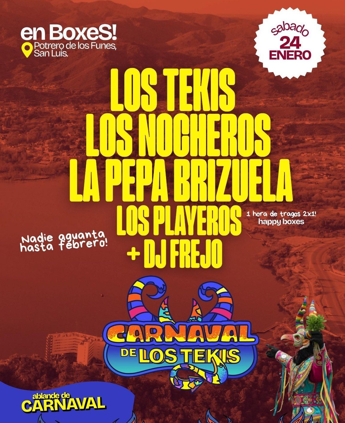 El Gobierno provincial presentó la agenda cultural y recreativa para este fin de semana en Potrero de los Funes y la Villa de Merlo, con propuestas que incluyen música en vivo, eventos al aire libre y artistas de proyección nacional. En Potrero de los Funes, este sábado 24 a partir de las 22:30, se realizará el Ablande Carnaval en Boxes, un evento que reunirá a destacados artistas del folklore y la música popular. La grilla estará integrada por Los Tekis, Los Nocheros, La Pepa Brizuela, Los Playeros y DJs invitados.