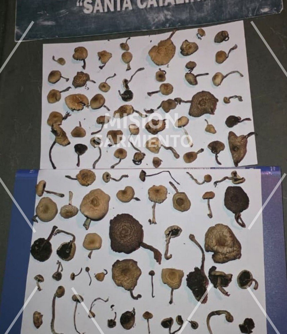 Durante la requisa del vehículo, el can Roma detectó una mochila camuflada que contenía en su interior una bolsa de nylon con 88 hongos alucinógenos.