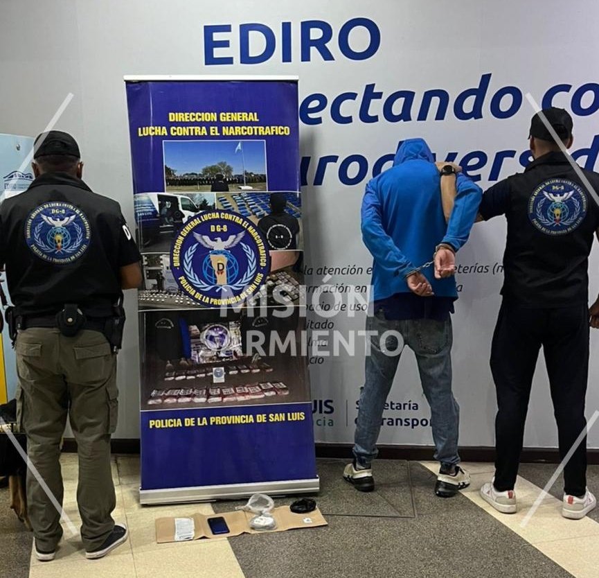 Este jueves 12 de marzo, en el marco de las acciones de la “Misión Sarmiento” y como resultado de tareas preventivas por infracción a la Ley 23.737 de Estupefacientes, efectivos de la Dirección General de Lucha Contra el Narcotráfico de la Policía de la Provincia llevaron a cabo un procedimiento en la Estación de Interconexión Regional de Ómnibus (EDIRO) de San Luis, donde incautaron una importante cantidad de droga.