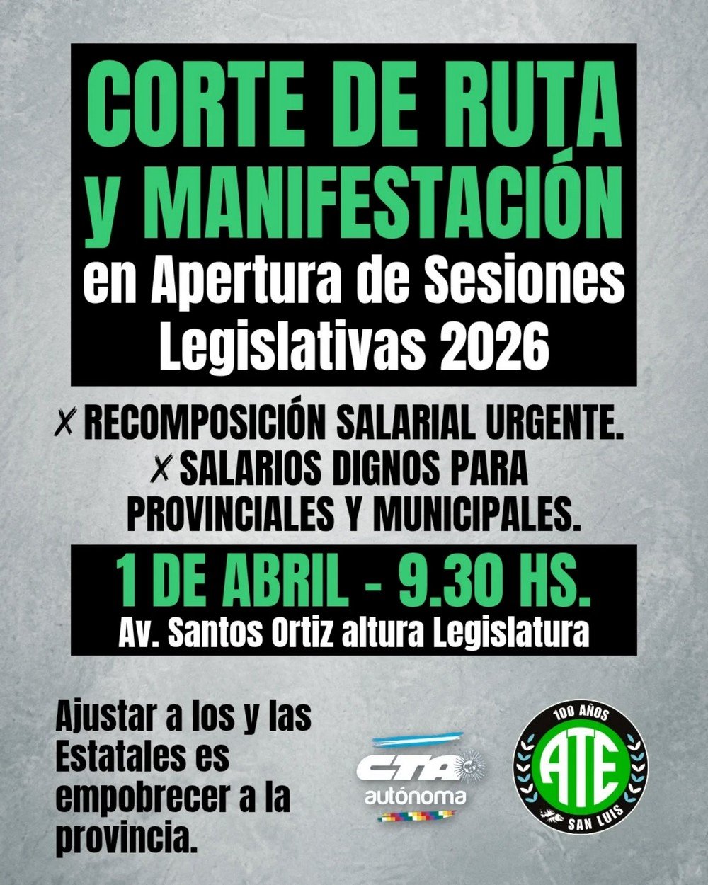 La Asociación de Trabajadores del Estado (ATE) convocó a un corte de ruta y manifestación para el miércoles 1° de abril en la ciudad de San Luis, en coincidencia con la apertura del período de sesiones ordinarias de la Legislatura provincial.