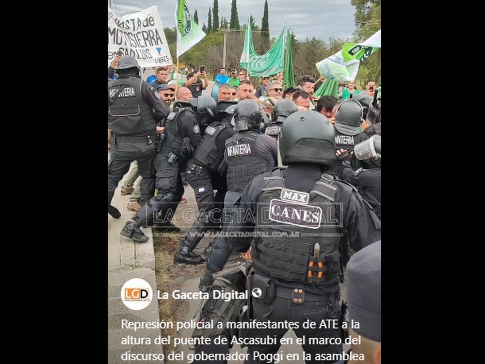 Represión policial a manifestantes de ATE a la altura del puente de Ascasubi en el marco del discurso del gobernador Poggi en la asamblea legislativa. La Policía no les permitió en principio el ingreso hasta la Legislatura provincial, mientras que jubilados e integrantes de APTS y UTEP accedieron sin problemas.